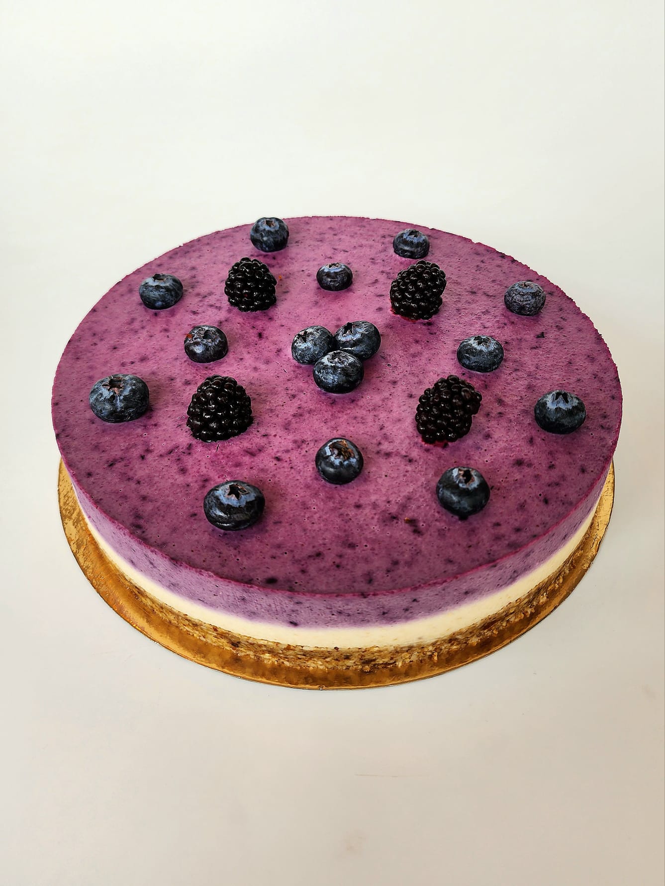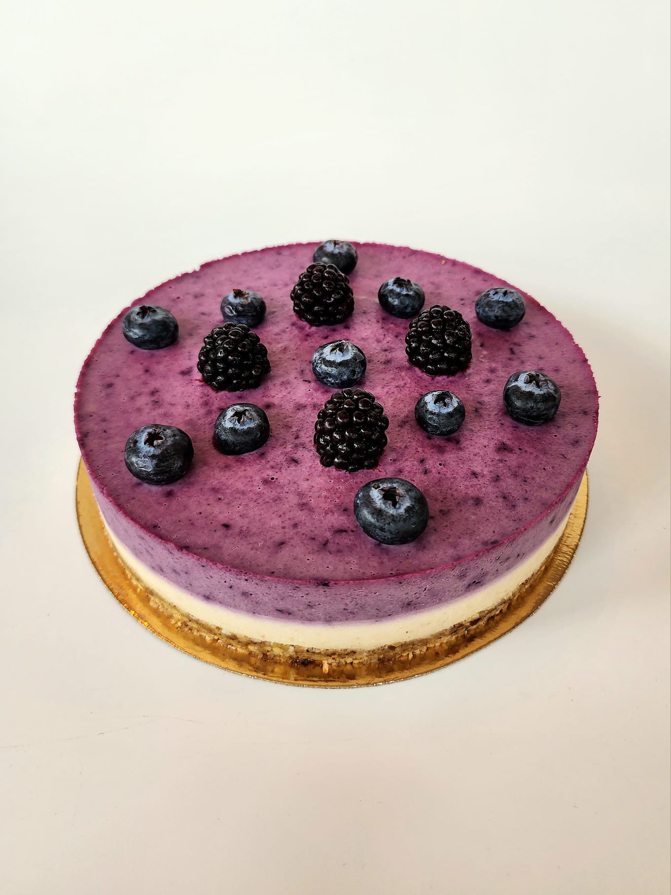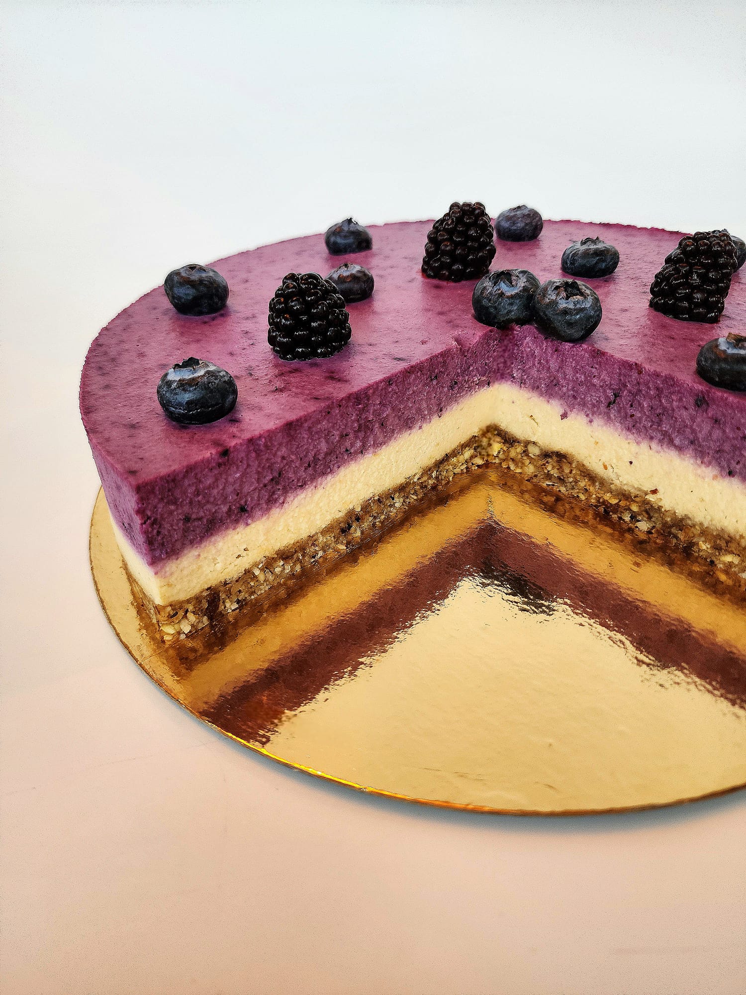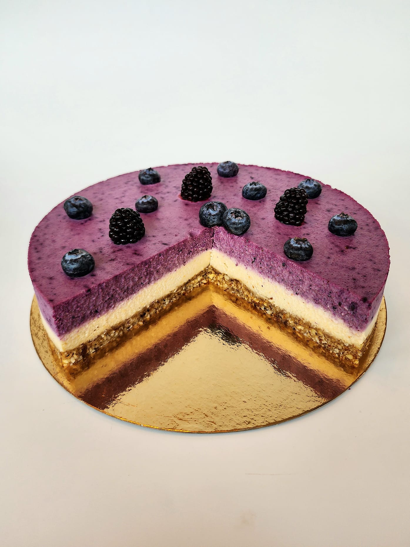 Tort delicios și foarte cremos, raw vegan cu blat crocant din caju, migdale, curmale, unt de cocos și fulgi de cocos. Peste blat am adăugat o cremă delicioasă de caju caju, unt de cocos, sirop de karob, sirop de agave, vanilie naturala, lapte de migdale iar pentru o aromă mai intensă am adăugat și al doilea strat de cremă de caju cu afine, lavandă, vanilie naturală, sirop de agave, sirop de karob și mure.
